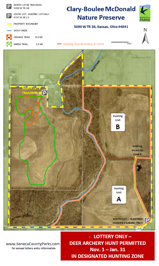 The Seneca County Park District will be holding a lottery drawing for a limited number of permits to archery deer hunt at Clary-Boulee McDonald Nature Preserve located at 4747 W. State Route 12, Kansas OH 44841. Hunting will be allowed at this location beginning November 1st, 2025 and continuing through January 31st, 2026 for those selected through the lottery, and winners will be assigned a time during either Session 1 (Nov 1 - Dec 15) or Session 2 (Dec 16 - Jan 31). Winners will be assigned one of the two available designated hunting areas, Hunting unit A or Hunting Unit B. Registration is open through 10/19/2025.